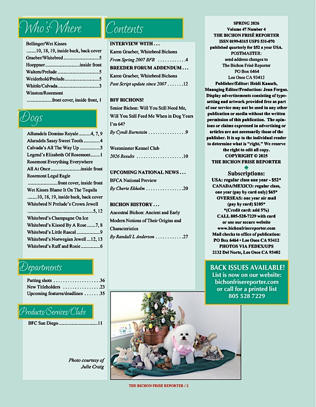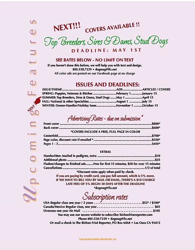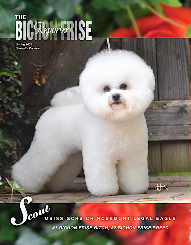 …the Bichon Frise magazine read and saved by fanciers worldwide offers articles on all aspects of Bichon care. Every Bichon lover will appreciate the Bichon Frise Reporter, published quarterly, with monthly emailed news bulletins – all chock full of helpful articles, advice, tips, useful listings, and information from breeders, judges and handlers.
